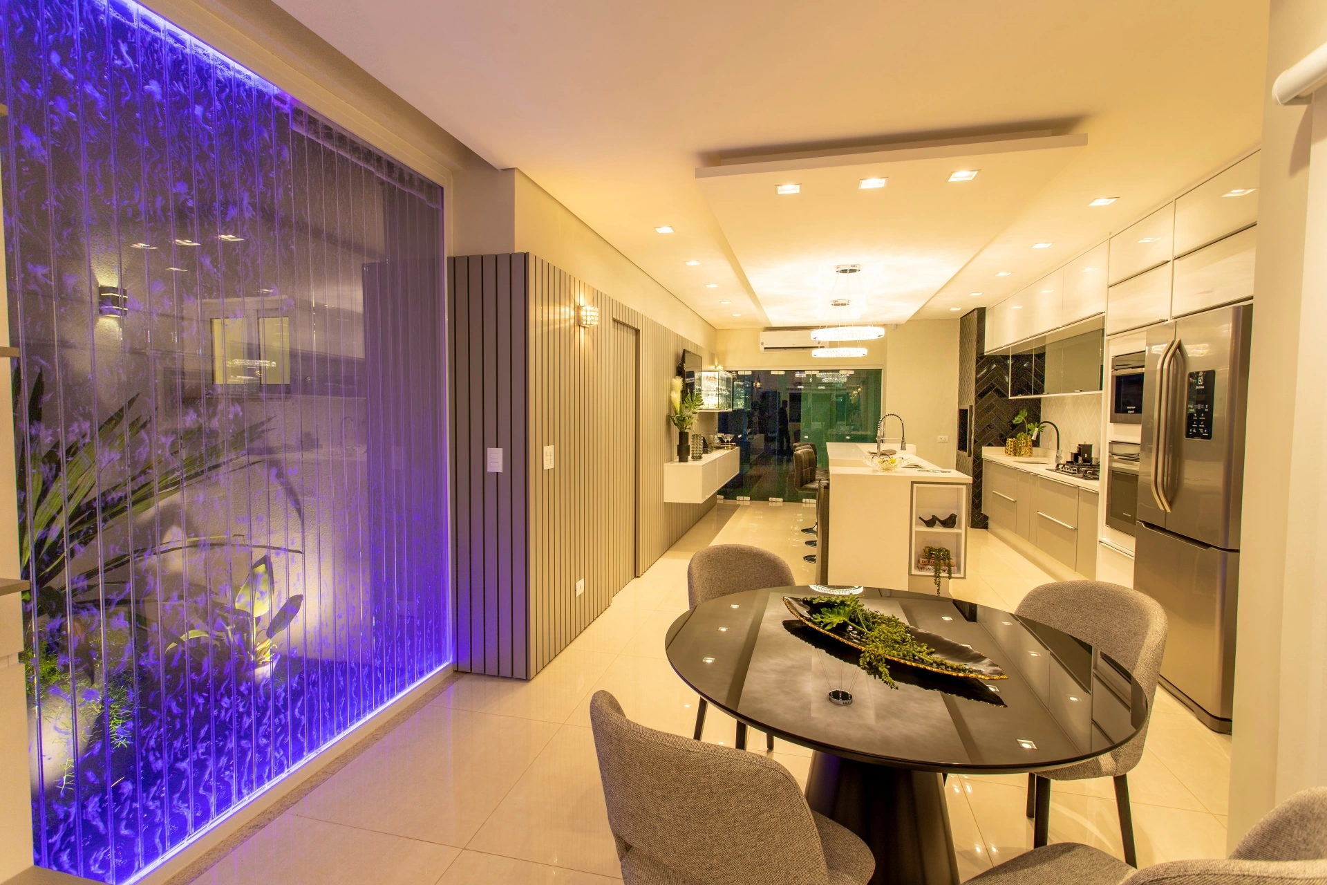 Foto 04: Foto executada de uma sala integrada com a cozinha gourmet, projeto autoral de paisagismo do escritório de arquitetura Adriana Lima Arquitetura & Interiores.